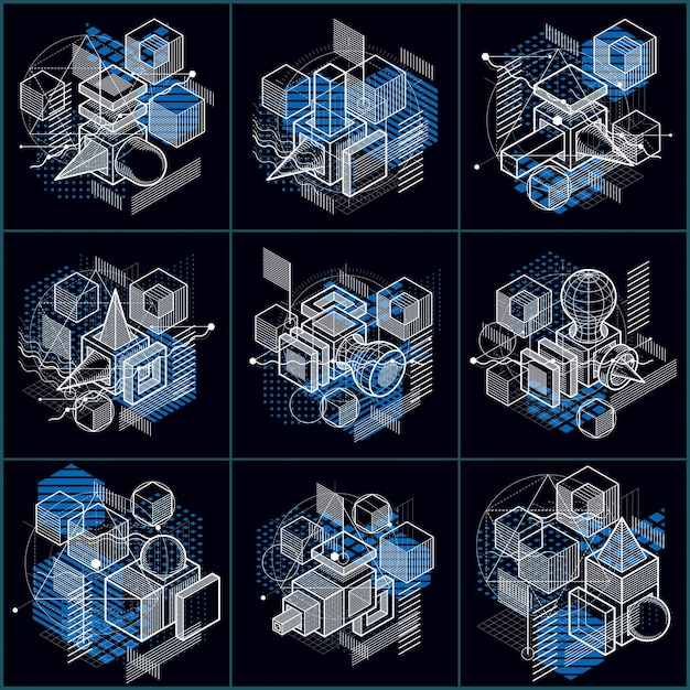 抽象的な 3 d 形状の組成、等角投影の背景をベクトルします。立方体、六角形、正方形、長方形、およびさまざまな抽象要素の構成。ベクトルのコレクション。