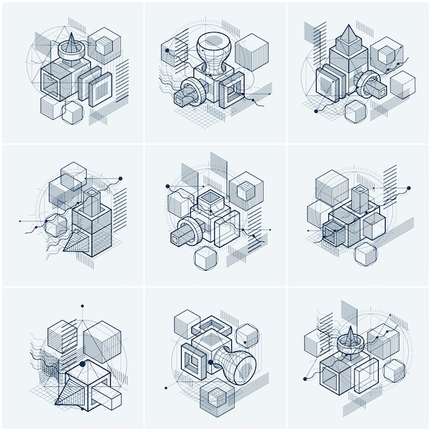 線とさまざまな要素を持つアイソメ抽象化、抽象的な背景をベクトルします。立方体、六角形、正方形、長方形、およびさまざまな抽象要素の構成。ベクトルを設定します。
