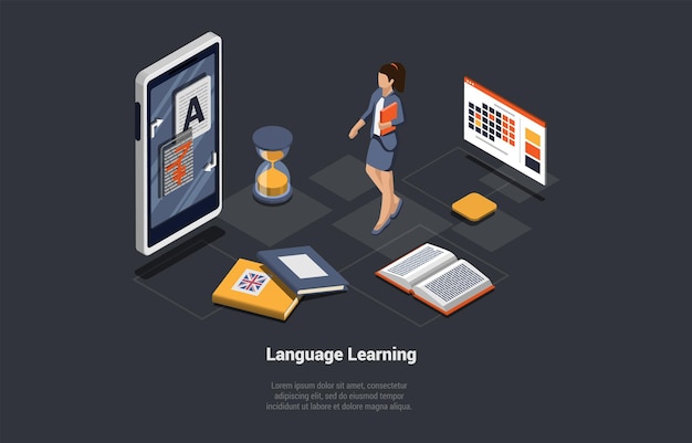言語学習アプリの学生は、オンライン学校で外国語を学ぶコースを持っている女の子は、スマートフォンの画面で見ている言語学習のためにリモートサービスを使用しています等角投影の3Dベクターイラスト